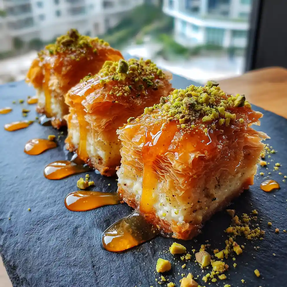 - Prepare Phyllo Layers: Brush phyllo sheets with melted butter, sprinkle with pistachios and sugar, and stack three layers.