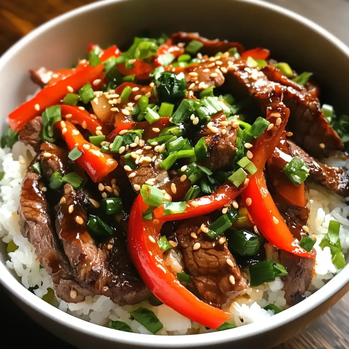A savory, quick-to-make beef and pepper rice bowl with tender flank steak, crisp veggies, and umami-packed sauces. Perfect for weeknight dinners!