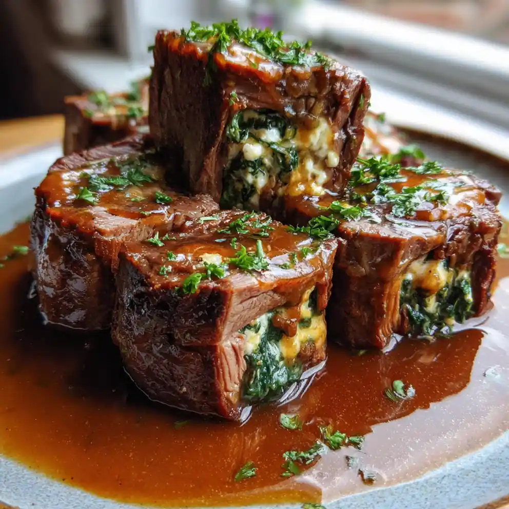 This recipe transforms a beef chuck shoulder roast into an impressive meal by stuffing it with a creamy spinach and feta filling, resulting in a tender braised dish with a beautiful colorful swirl in every slice.