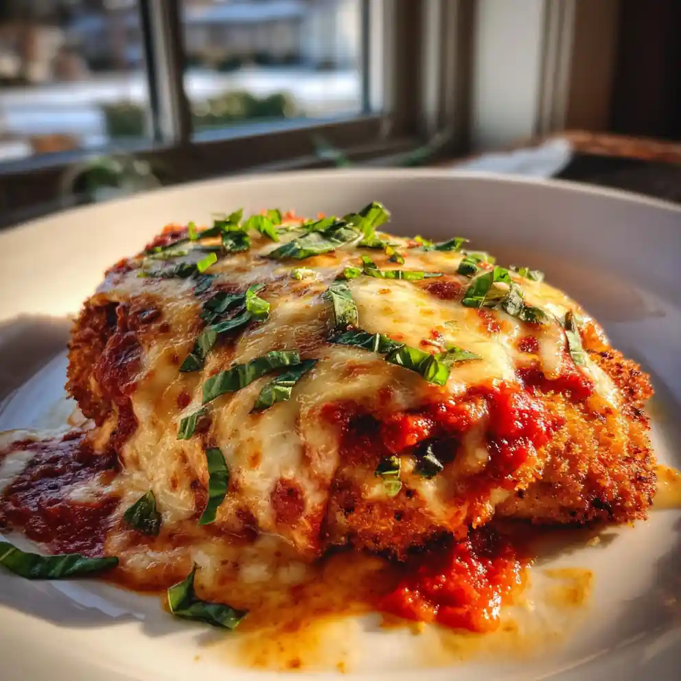 - Finish and Serve: Bake for 15-20 minutes, or until the cheese is melted, bubbly, and lightly golden brown. If desired, broil for the last 1-2 minutes for extra browning on the cheese, watching carefully to prevent burning. Let rest for 5 minutes before serving; garnish with fresh basil leaves to finish this impressive chicken parmesan cutlet.