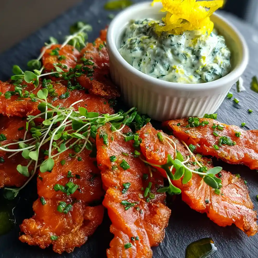 9. Plate and Garnish: Arrange the crispy salmon strips in a visually appealing fan shape on a dark-colored plate. Place a ramekin of the chilled herb tartar dip in the center. Drizzle a thin line of extra-virgin olive oil around the rim of the plate for a glossy finish. Garnish with microgreens and a lemon zest curl.