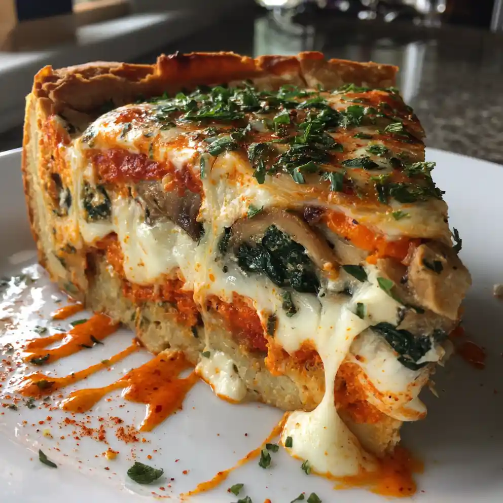 Slice the deep dish pizza into wedges in the pan. Sprinkle with finely chopped fresh parsley and a pinch of smoked paprika. Serve immediately on a rustic plate to highlight the thick, colorful layers.