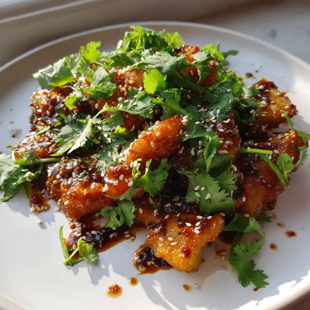 - Finish & Garnish: Remove from heat; stir in half chopped cilantro. Serve immediately on a white plate, garnishing with remaining cilantro and 1 tsp sesame seeds for a final flourish.