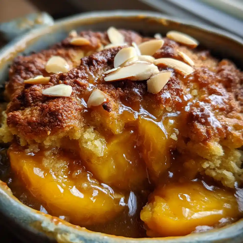 This easy peach cobbler recipe takes the classic dessert and elevates it with a rich caramel sauce and crunchy almonds. It features juicy peaches, a tender topping, and aromatic twists for a gourmet yet simple result.