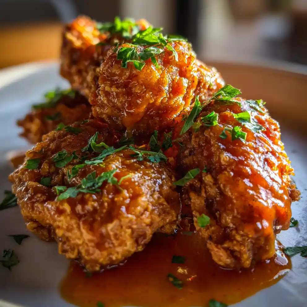 - Glaze and Garnish: Once cooked, transfer the hot fried chicken to a wire rack set over a baking sheet to drain any excess oil. Immediately place the hot fried chicken pieces in a large bowl. Pour about two-thirds of the warm harissa honey glaze over the chicken and gently toss to coat all pieces evenly. Serve immediately on a platter or plate, drizzling the remaining glaze over the top and finishing with a generous sprinkle of fresh, finely chopped parsley. This fried chicken recipe is best served hot.
