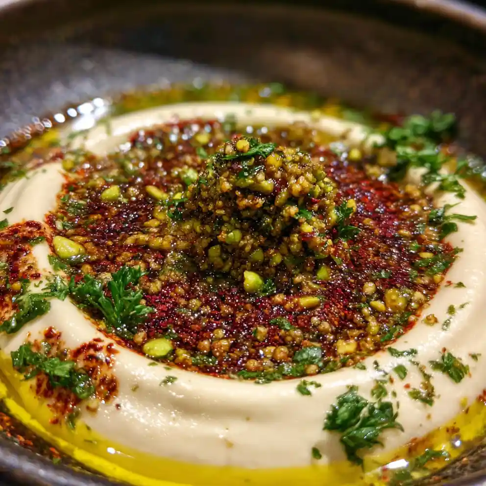 - Serve & Garnish: Serve the chilled dip in a shallow, dark-colored ceramic bowl to maximize color contrast. Create a central swirl with the back of a spoon, then drizzle the 15 ml (1 tbsp) extra virgin olive oil in a circular pattern around the swirl. Generously sprinkle the toasted Pistachio Dukkah mix over the center, then dust the edges with 5 g (1 tsp) ground sumac. Finish by scattering the 5 g (1 tbsp) finely chopped fresh parsley for a vibrant color pop. The presentation should be colorful and inviting.