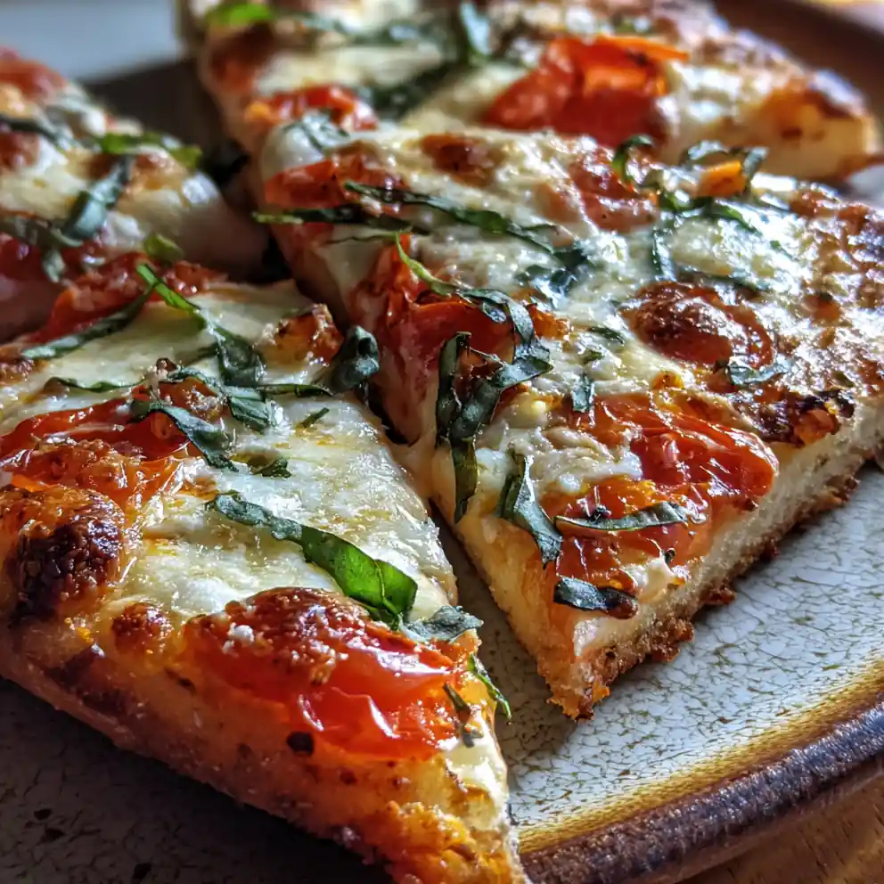 8. Garnish and Serve: Carefully remove the hot pizza from the oven. Let it rest for 2-3 minutes before slicing into wedges. Garnish with fresh basil leaves for a vibrant final touch on this greek yogurt pizza dough recipe.
