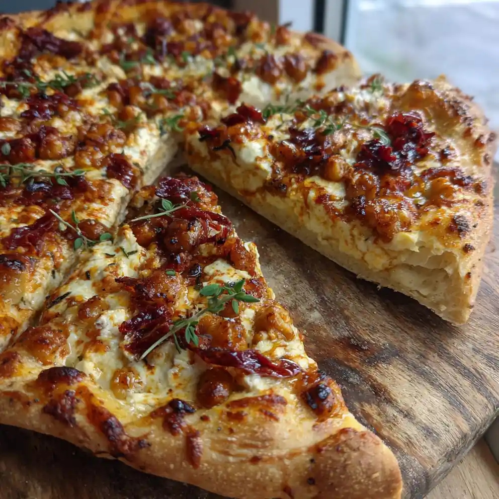 A high-protein pizza featuring a chewy crust enhanced with vital wheat gluten, topped with sun-dried tomatoes, chickpeas, mozzarella, and finished with a creamy roasted red pepper and feta swirl.