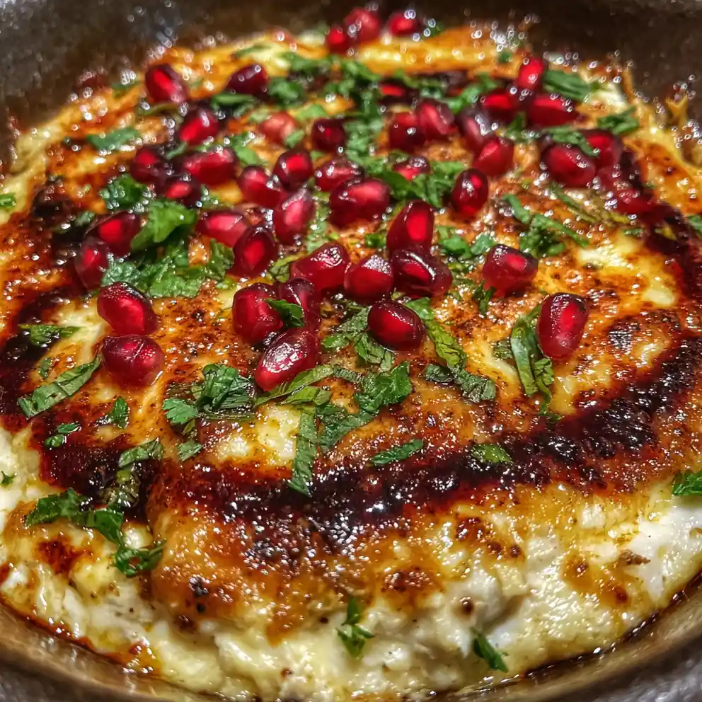 - Rest, Garnish, and Serve: Remove the dip from the oven and let it rest for 5-10 minutes before serving. Drizzle with pomegranate molasses, scatter fresh pomegranate seeds, then sprinkle the remaining 2.5 ml (0.5 tsp) ground sumac, 2.5 ml (0.5 tsp) za’atar, and the finely chopped fresh parsley and mint over the top. Serve hot in its warm baking dish.