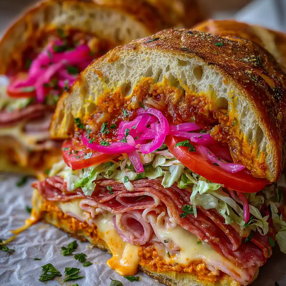 This Italian grinder sandwich recipe offers a hearty and fresh family meal solution, featuring toasted crusty rolls filled with a creamy, zesty roasted red pepper and harissa aioli, savory deli meats, provolone cheese, and a vibrant quick pickled red onion and parsley salad.