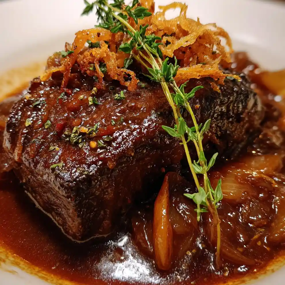 - Serve and Garnish: Slice the rested roast against the grain. Arrange the slices on a warm white ceramic plate, spoon generous amounts of the onion-laden sauce over and around the meat. Drizzle a thin stream of reduced sauce in a spiral for visual contrast. Garnish each portion with a fresh thyme sprig, scatter fried shallot crisps, and finish with a light dusting of smoked paprika for color. Serve immediately while hot, accompanied by crusty bread or buttery mashed potatoes, if desired.