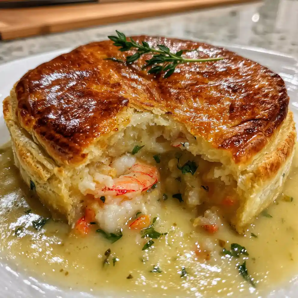Indulge in a luxurious seafood pot pie featuring succulent shrimp and sweet lobster in a creamy cheddar sauce, topped with flaky cheddar biscuits infused with lemon and thyme. This elevated comfort food is perfect for special occasions or a delightful treat.