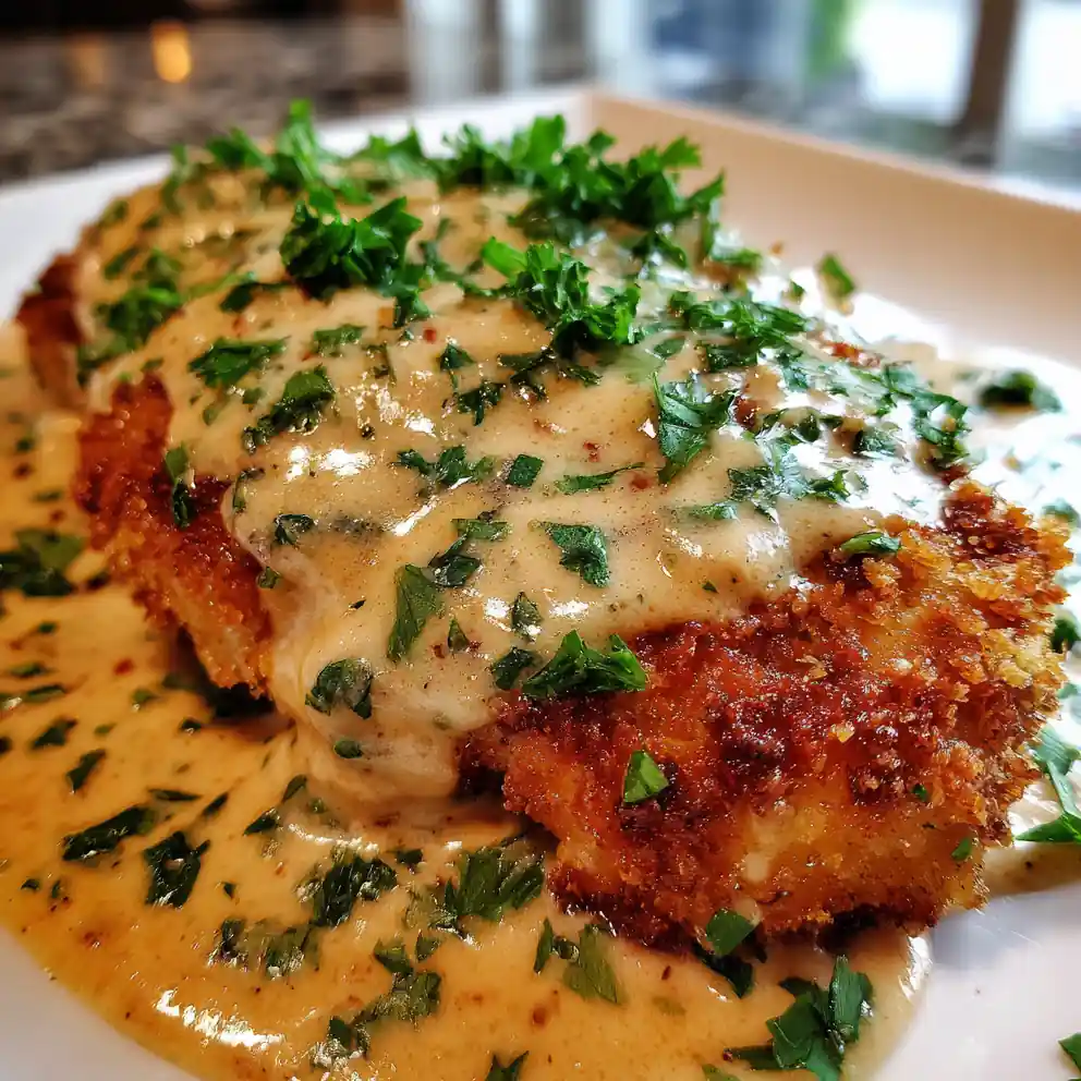 6. Serve: Arrange the resting longhorn steakhouse parmesan crusted chicken on a warm plate. Spoon a generous amount of the vibrant Smoky Red Pepper Cream over and around the chicken. Garnish with a sprinkle of fresh, finely chopped Italian parsley and a light dusting of smoked paprika over the sauce for enhanced presentation.