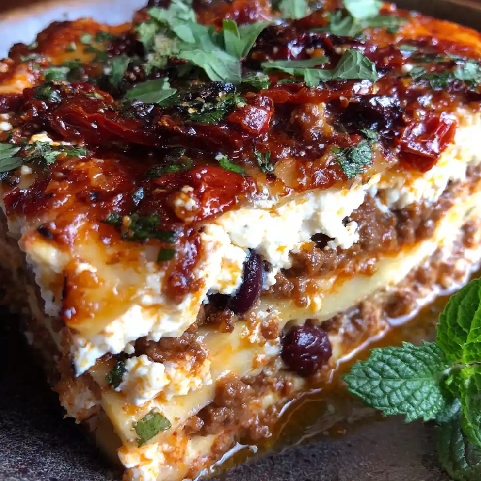 - Assemble Lasagna Layers: Spread a thin layer of meat sauce on the bottom of the prepared baking dish. Arrange 3-4 lasagna noodles over the sauce, breaking them if needed to fit. Spread half of the ricotta mixture evenly over the noodles. Sprinkle with one-third of the shredded mozzarella and one-third of the grated Parmesan-style cheese. Scatter half of the chopped sun-dried tomatoes, half of the halved Kalamata olives, and half of the crumbled feta cheese over the cheese layer. Repeat these layers: another layer of noodles, the remaining ricotta mixture, another third of mozzarella and Parmesan-style cheese, and the remaining sun-dried tomatoes, Kalamata olives, and feta cheese. Finish with a final layer of noodles, topped with the remaining meat sauce, and sprinkle generously with the last third of mozzarella and Parmesan-style cheese.
