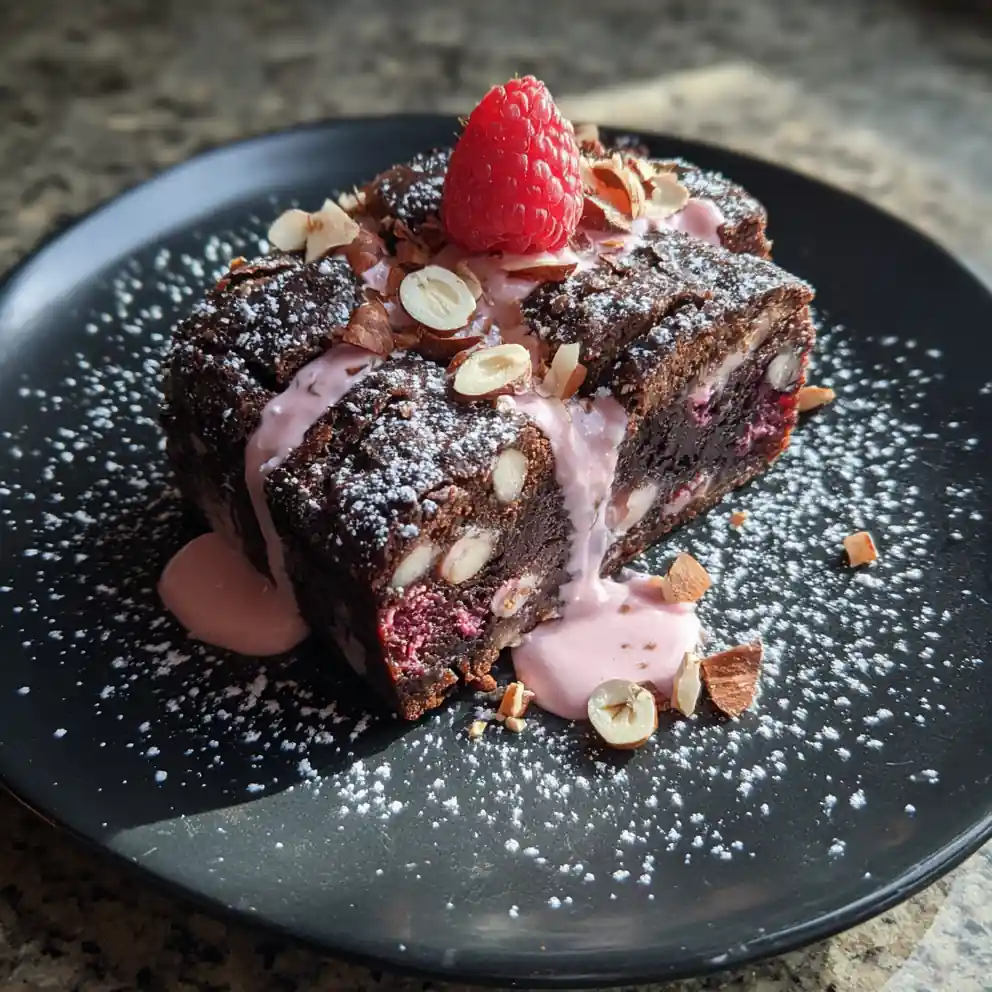 - Garnish & Serve: Dust each brownie with a light veil of powdered sugar. Drizzle any remaining raspberry white chocolate ganache around the plate for an elegant touch. Scatter crushed toasted hazelnuts over the brownies for added crunch and flavor. Finally, place a sliced fresh raspberry on top of each brownie for a pop of color and freshness.