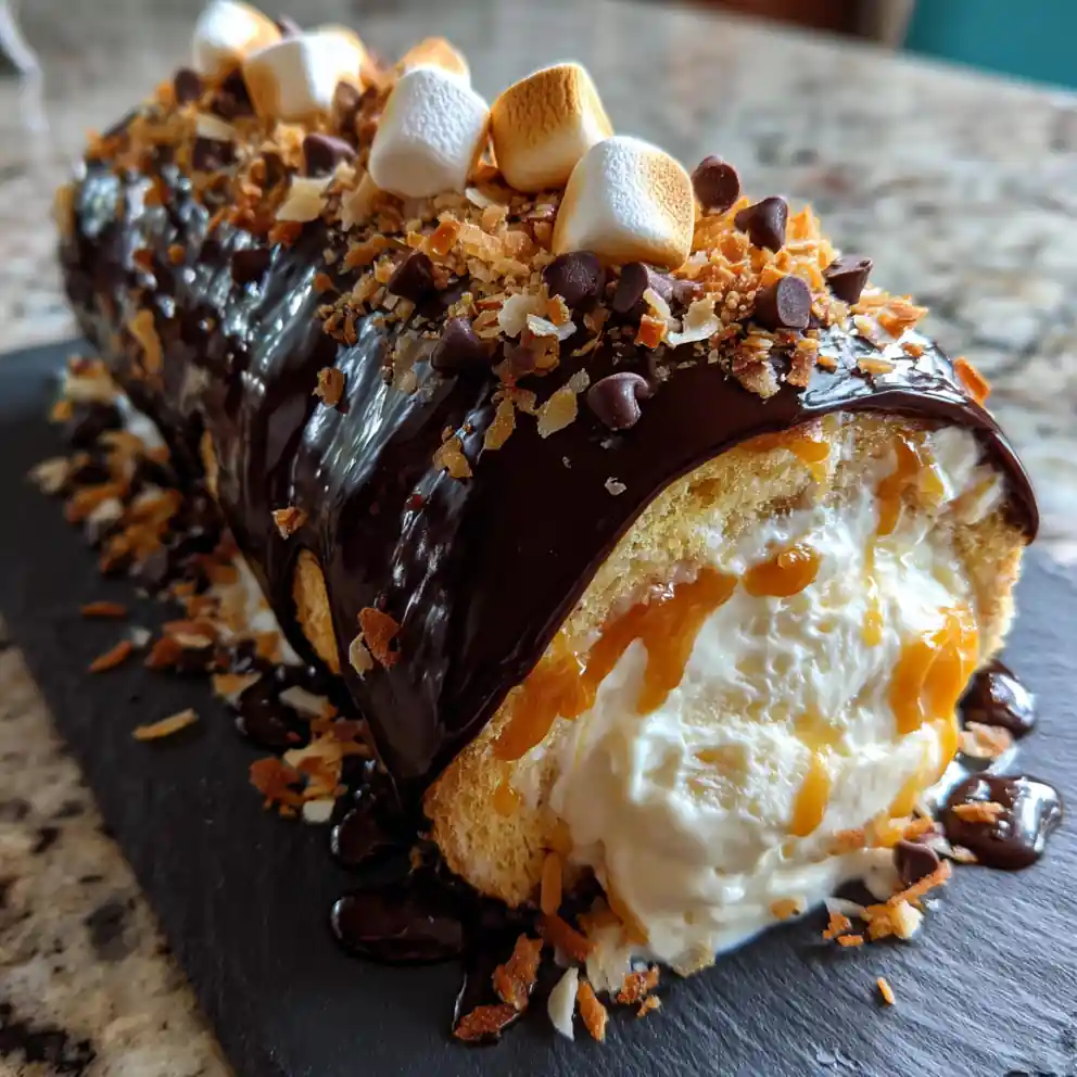 Indulge in a playful and decadent S’mores Cookie Dough Ice Cream Roll featuring a luscious honey-butter coconut swirl. This frozen creation combines creamy ice cream with chewy cookie dough and gooey marshmallows for a delightful textural and flavorful experience.