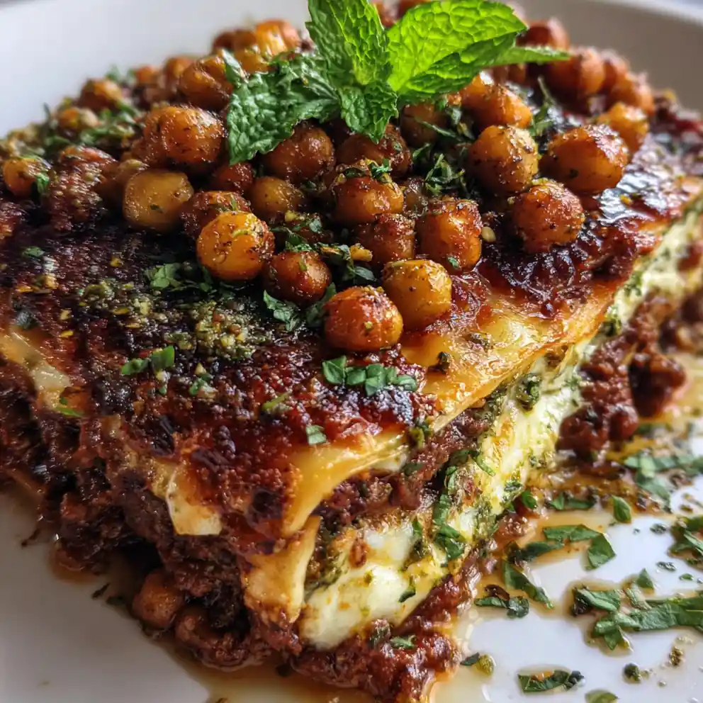 5. Bake Lasagna & Rest: Cover the baking dish tightly with aluminum foil. Bake for 25 minutes. While the lasagna bakes, place the baking sheet with chickpeas into the oven alongside it and roast for 20-25 minutes, or until golden and crispy, tossing halfway through. Remove chickpeas when done. Remove foil from the lasagna and bake for an additional 20-25 minutes, or until the top is beautifully golden brown and bubbly. For extra browning, you can briefly broil for 2-3 minutes, watching carefully to prevent burning. Let your simple lasagna recipe rest for 10-15 minutes before slicing; this crucial step allows the layers to set, preventing it from falling apart.