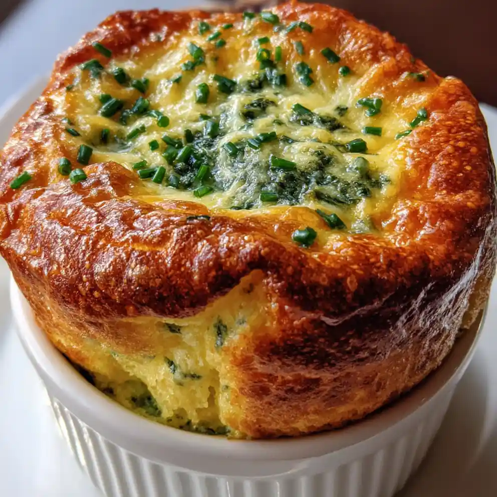 This Gruyère-Topped Spinach Souffle is an elegant dish featuring wilted spinach, nutty Gruyère cheese, and fluffy eggs, all baked to a golden puff. It is a flavorful side dish or light main course, garnished with fresh chives for a vibrant finish.
