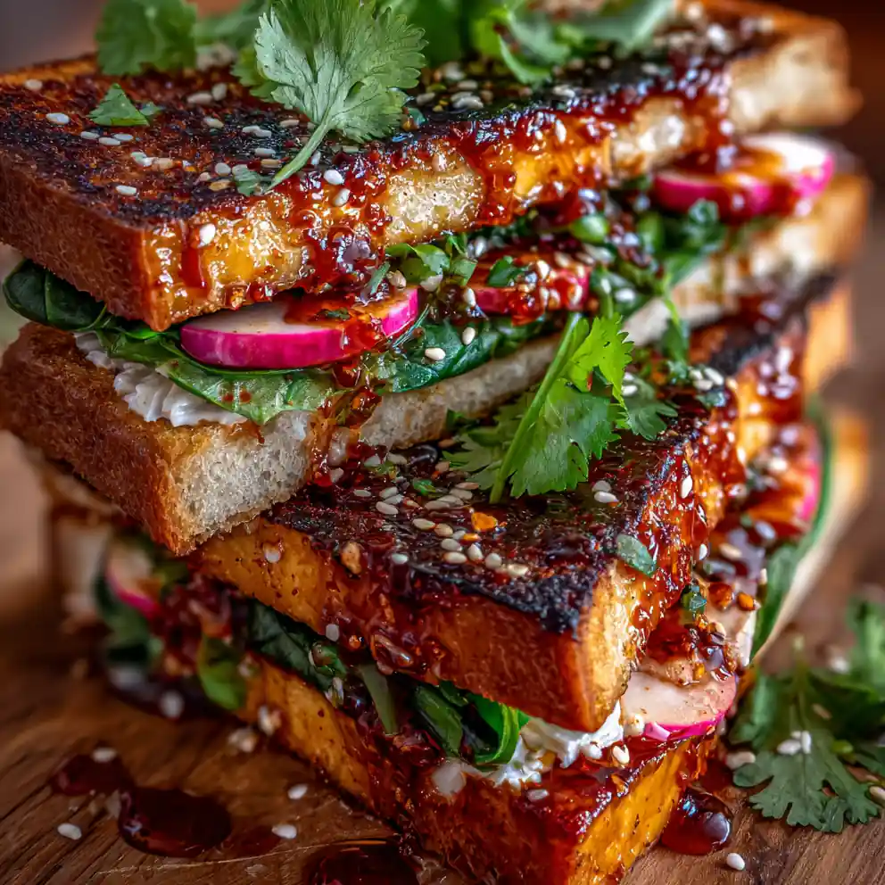 9. Serve Sandwiches: Top with the remaining bread slices. Cut each sandwich diagonally into halves. Garnish with fresh cilantro or scallions and sesame seeds for a beautiful presentation.